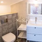 Kambariai turi privačią vonią. Įrengta stovėjimo dušas ir atskiras tualetas.